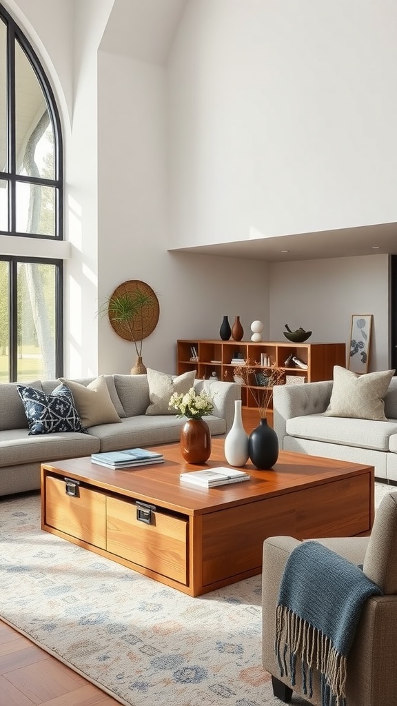 Choosing the right coffee table can enhance your living room’s vibe. Look for one that matches your style and offers flexibility. The table in the picture reflects a modern aesthetic with a hint of warmth from the wood, striking a balance that makes the room feel inviting.