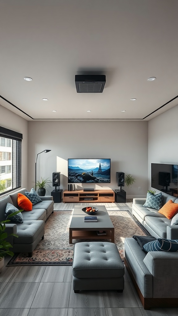 Don’t overlook the lighting! The recessed lights and the stylish floor lamp help set the mood, whether you’re watching a film or just hanging out. Overall, this layout combines comfort and practicality, making it a great example of how to create a welcoming entertainment area.