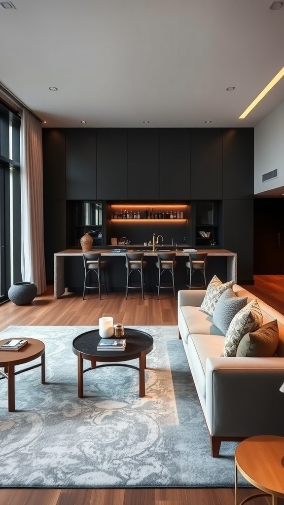 Creating a bar area in your large living room can be a fantastic way to enhance both style and functionality. The image shows a spacious area with a sleek bar setup, perfect for entertaining guests or enjoying a quiet drink after a long day. The wood paneling and modern lighting create a welcoming vibe.