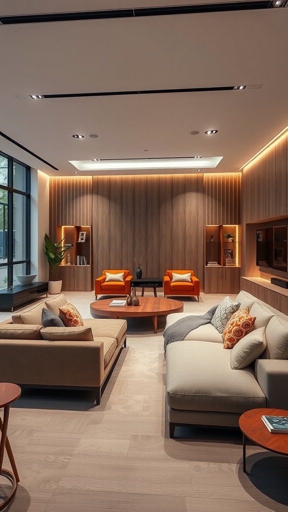 The warm lighting, modern furniture, and carefully placed electronics create a cozy yet sophisticated atmosphere. Using smart lighting can adjust brightness based on the time of day, making the room feel inviting.