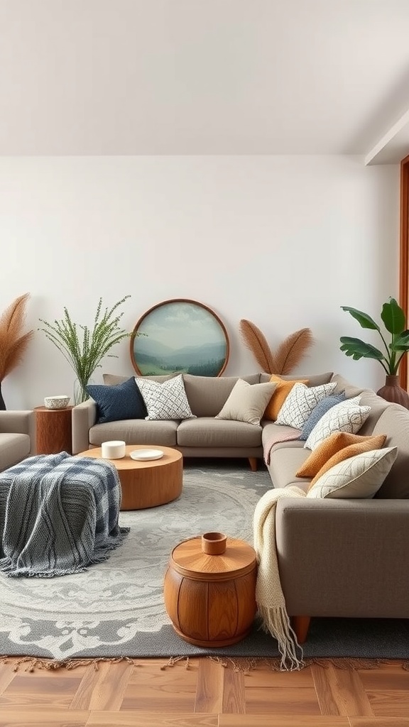 Plants in the corners bring a touch of nature inside, enhancing the overall feel of the room. Decorative elements like cushions and artwork contribute to a cozy yet stylish look. This kind of space can adapt to various activities, from family gatherings to quiet evenings in.