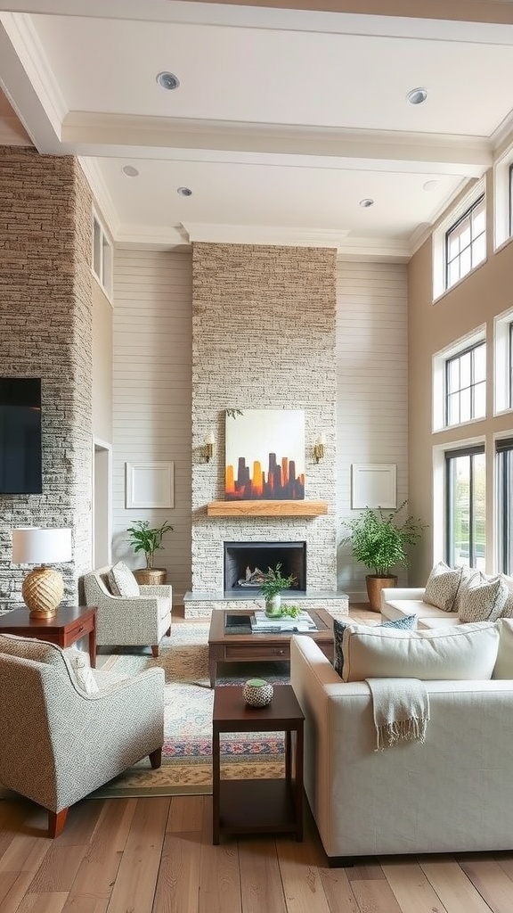 Textured walls can transform a large living room into a cozy space that feels both inviting and stylish. In the image, the combination of smooth and rustic elements creates a warm atmosphere.
