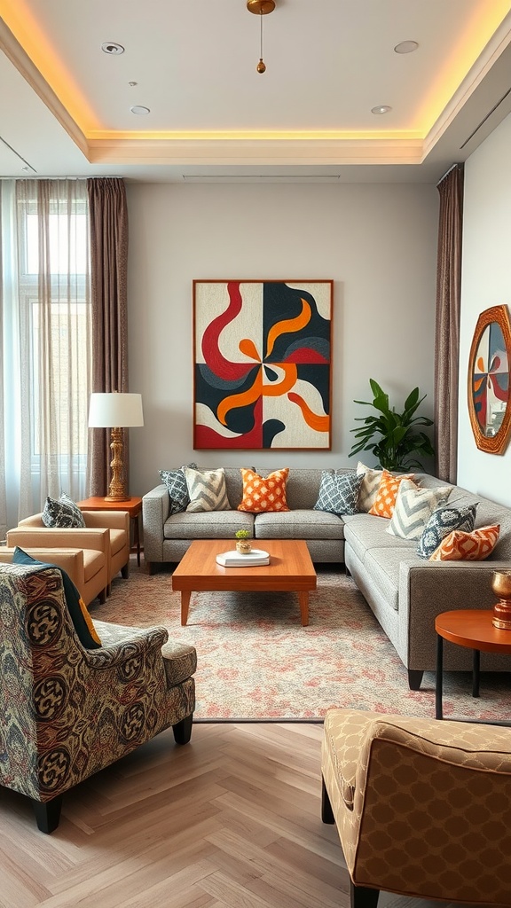 Mixing patterns can turn your living room into a vibrant space. In the image, you see a beautiful blend of textures and colors that create a lively atmosphere. The sofa features an array of decorative pillows, each with unique patterns, adding visual interest.