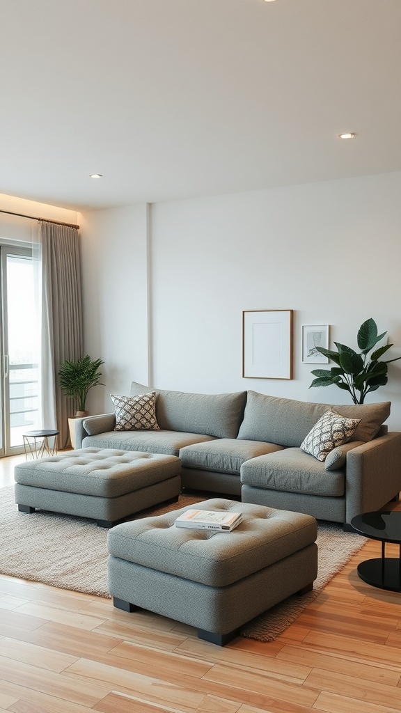 In a large living room, multi-functional furniture can really make a difference. The image showcases a cozy setup featuring a spacious gray sectional sofa with soft, inviting cushions. This type of seating not only provides ample room for family and friends but also doubles as a comfortable spot for lounging.