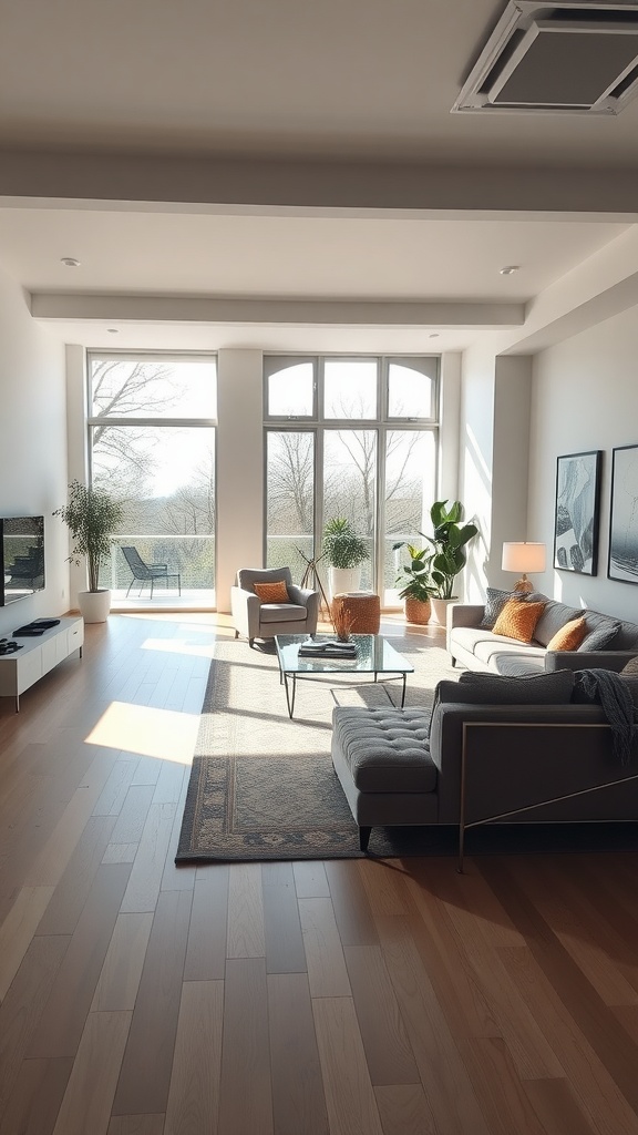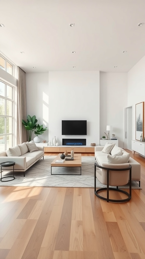 The layout emphasizes open space, making the living room feel airy and welcoming. The wooden flooring adds warmth and complements the modern aesthetic. Simple decor, like the potted plant and subtle art pieces, keeps the focus on the furniture while adding personality.