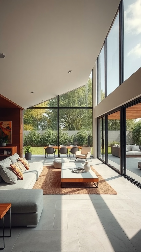 Bringing the outdoors into your living space can create a refreshing vibe. The image showcases a large living room that seamlessly connects with the outdoor area. The expansive glass walls allow for natural light flow while offering a beautiful view of the garden.