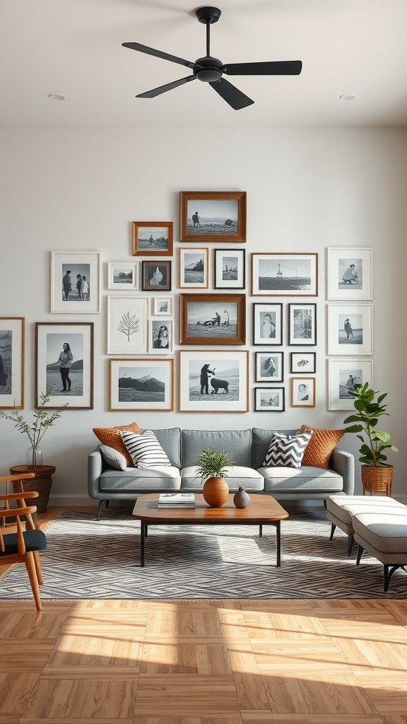 Creating a personalized gallery wall can be one of the most fun and rewarding projects for your large living room. The image showcases a stylish setup, featuring a mix of black-and-white photos framed in various wooden frames, giving a warm, inviting feel.