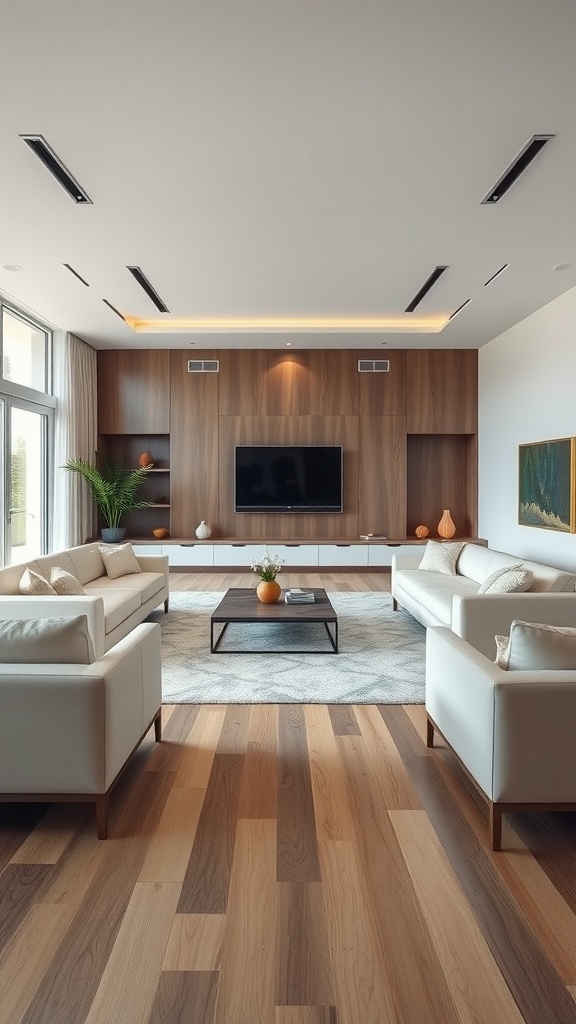 Neutral color schemes can really make a large living room feel open and inviting. In the image, you can see how soft beige sofas complement the warm wooden flooring, creating a calm atmosphere. The large windows let in plenty of natural light, enhancing the neutral tones and making the space feel even more expansive.