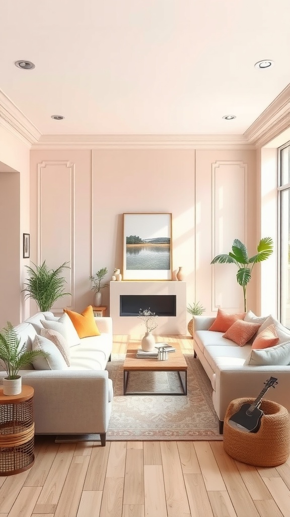 Soft color palettes can really transform a living room into a warm and inviting space. In the image, we see a lovely living room bathed in gentle blush tones. The wall color adds a hint of warmth, making it feel cozy and welcoming.