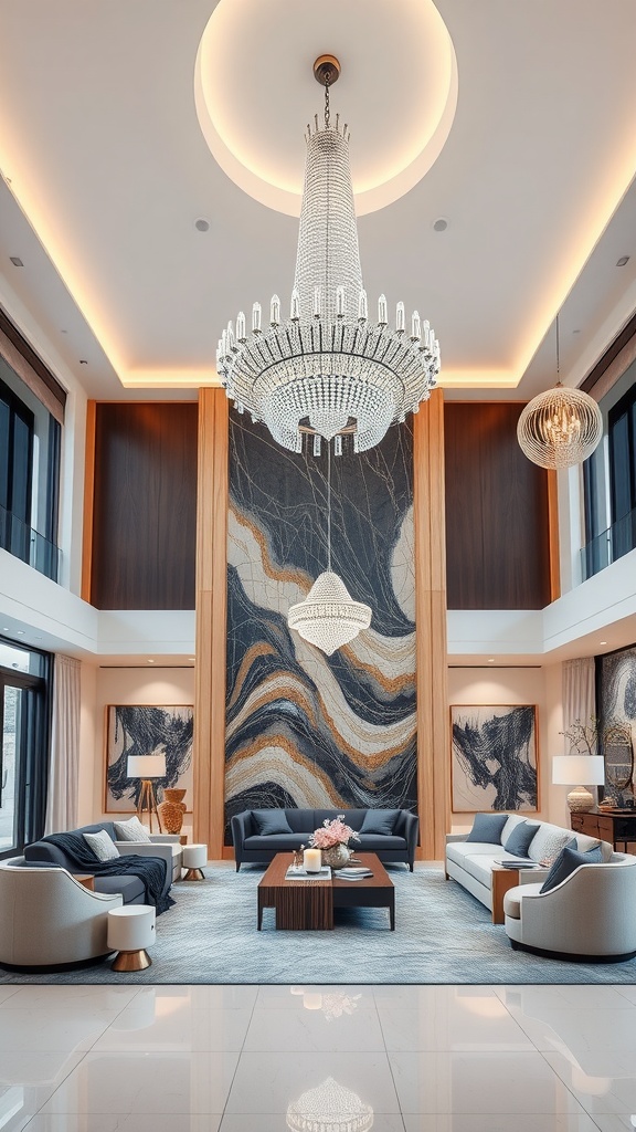 In a large living room, lighting plays a key role in creating a welcoming vibe. A standout lighting fixture can be the centerpiece that unites the entire space. Take, for instance, a grand chandelier hanging elegantly from the ceiling. Its intricate design draws the eye, enhancing the room’s overall style.