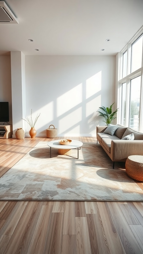 A stylish area rug can truly enhance the look of a large living room. The image showcases a bright and airy space featuring light wood flooring, complemented by a beautiful rug that adds warmth and texture. The rug’s design, with its soft hues, seamlessly ties together the seating area, making it feel inviting and cozy.