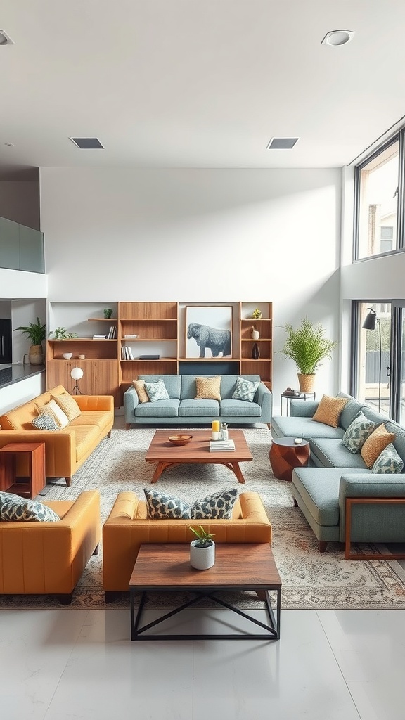 When it comes to large living rooms, furniture arrangement plays a key role in making the space feel inviting. The image showcases a spacious living room with an interesting mix of colors and textures. The combination of blue and orange sofas creates a cheerful yet sophisticated vibe.