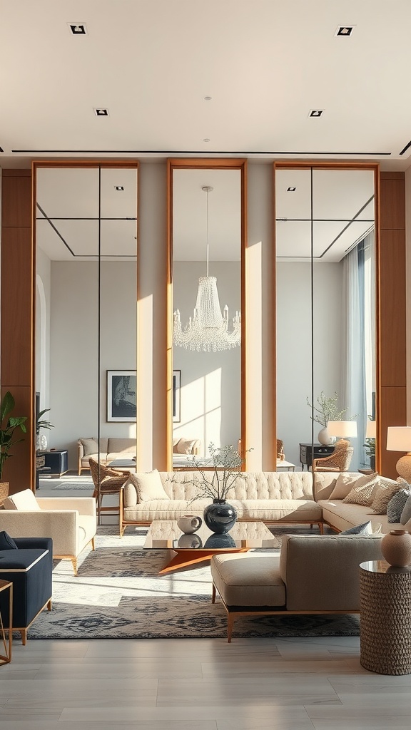 Mirrors are a fantastic tool for creating an illusion of space in large living rooms. This image showcases a beautifully designed living area where mirrors play a vital role in enhancing the overall look.