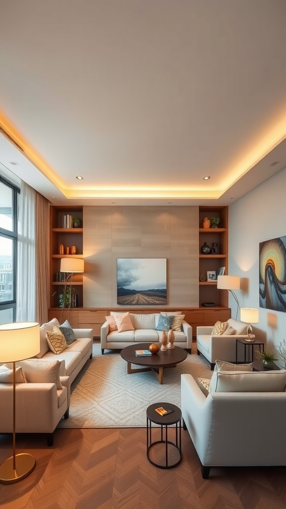 The recessed lighting on the ceiling adds an elegant touch without being too harsh. This layered lighting approach ensures that different areas of the room are well-lit, making it feel welcoming and spacious. The combination of various light sources can highlight your favorite art pieces or decor.