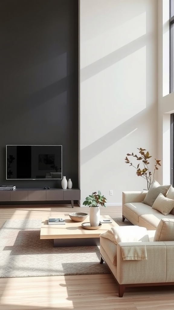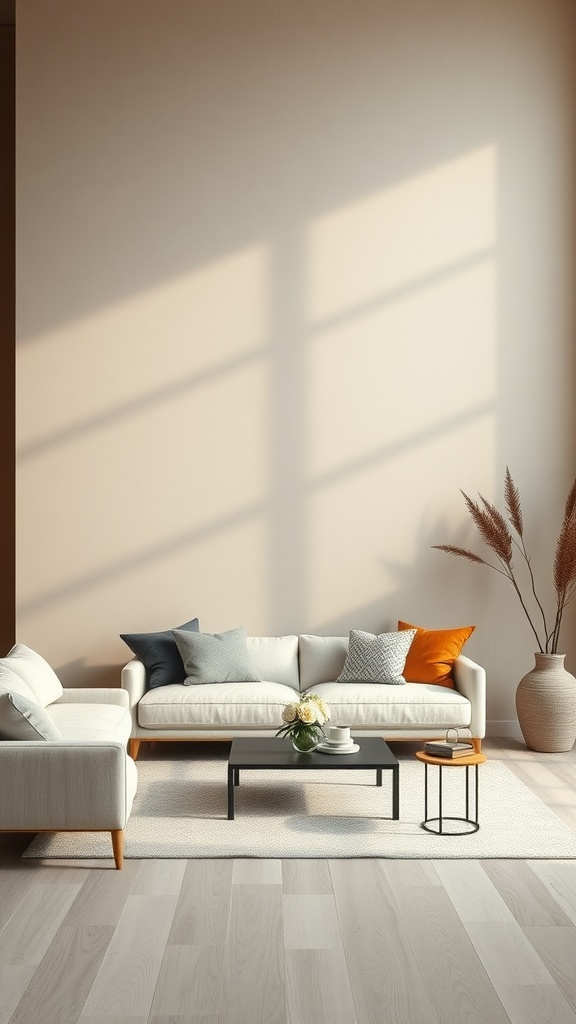 The furniture is sleek and functional, with a light-colored sofa that invites relaxation. The coffee table is simple yet stylish, balancing the overall design. Accessories, like the vases and cushions, add subtle warmth without cluttering the space.
