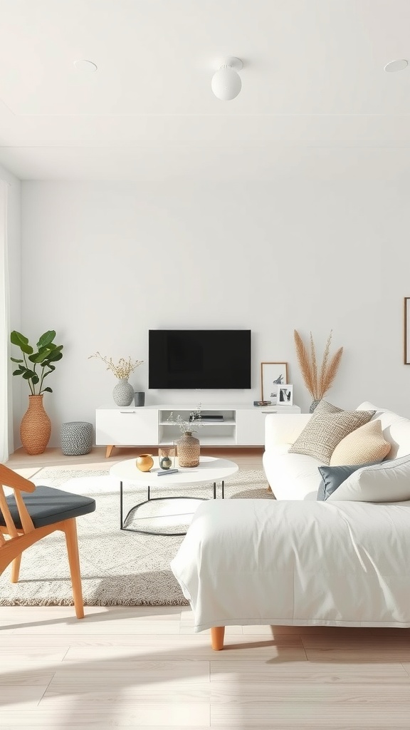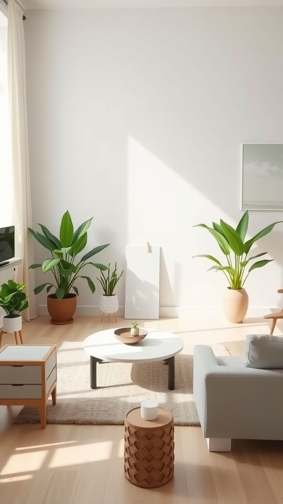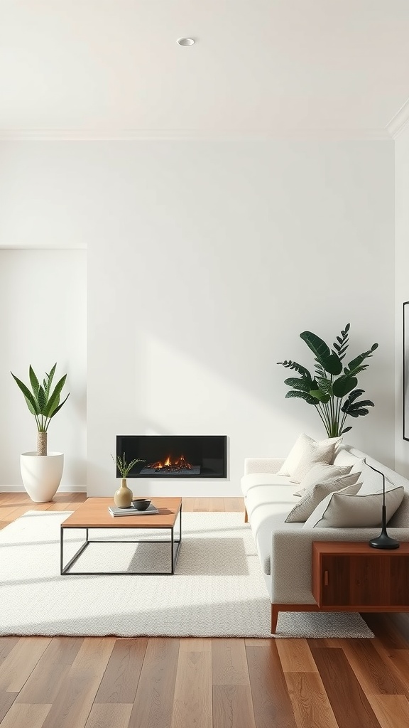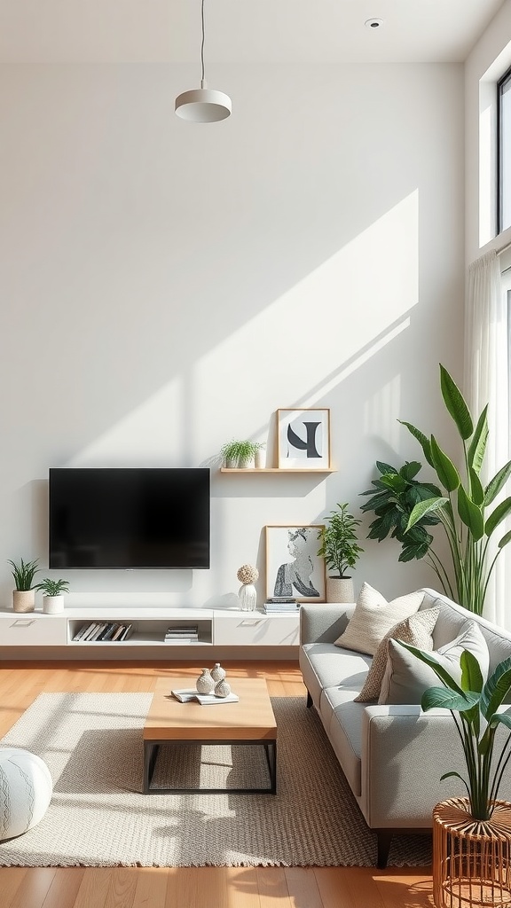 Bringing nature indoors can make your minimalist living room feel fresh and inviting. In the image, lush green plants breathe life into the space, creating a vibrant focal point amidst the simple decor.