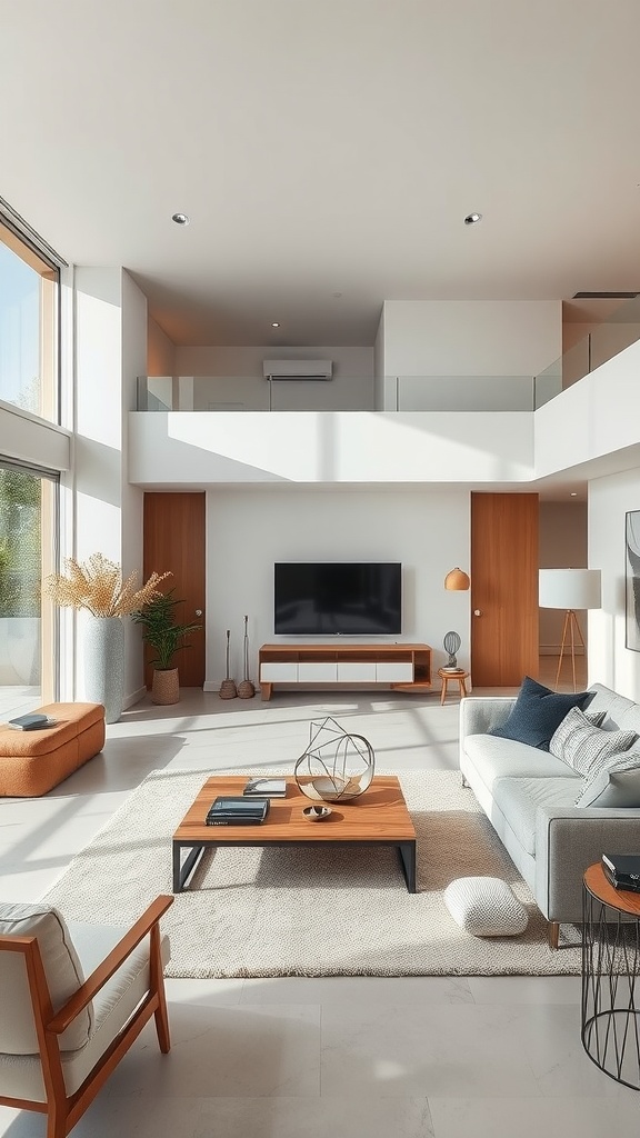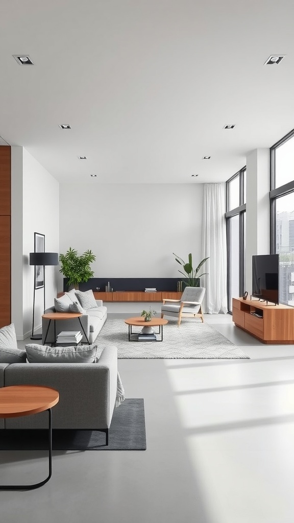 Negative space is key in minimalist design. In the image, you can see a spacious living room with intentional gaps around furniture. This openness gives the room a calm vibe.