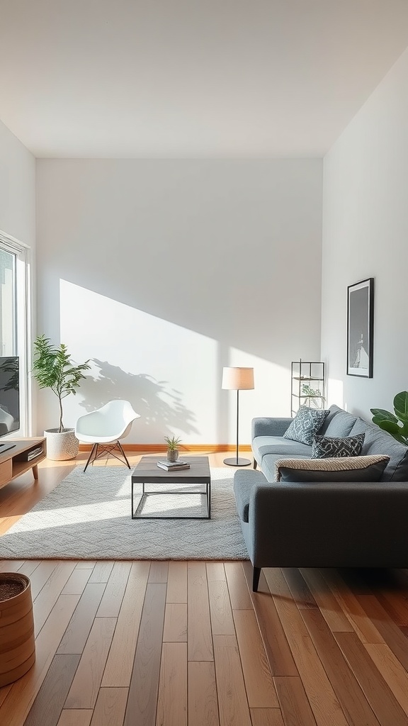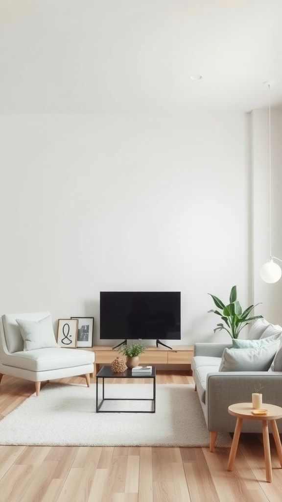 The furniture choices are simple yet stylish. A cozy gray sofa and a sleek chair offer comfort without overwhelming the space. The low coffee table adds functionality while keeping the look minimal.