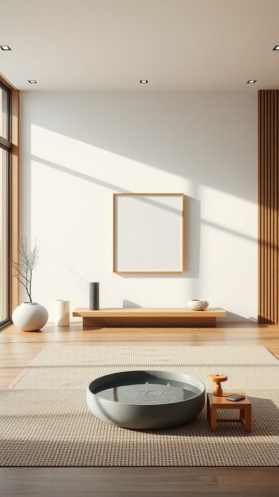 The focal point here is a round, shallow water feature. The gentle ripples in the water bring a sense of tranquility. Water has a way of soothing the mind, making it perfect for a Zen atmosphere.