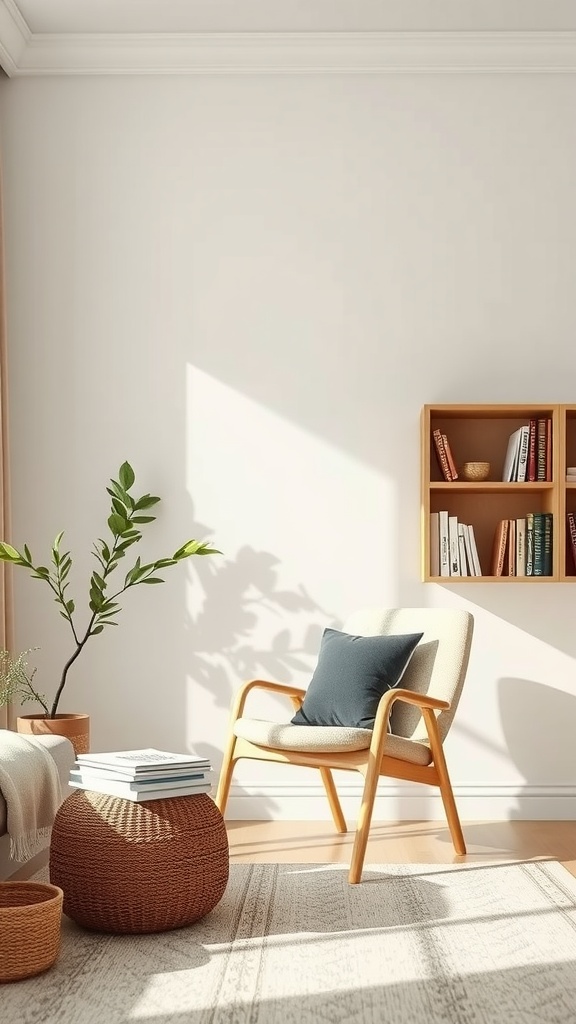 Cozy nooks are perfect for relaxing and unwinding. In the image, we see a minimalist living room with a simple chair that invites you to take a seat. The light color scheme creates a calm vibe, making it easy to feel at home.