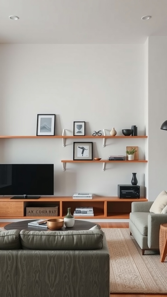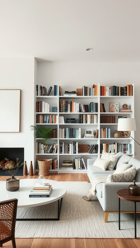 Using a neutral color palette on both the shelves and the walls makes the room feel spacious and bright. This is a great approach for anyone looking to create a peaceful living area.