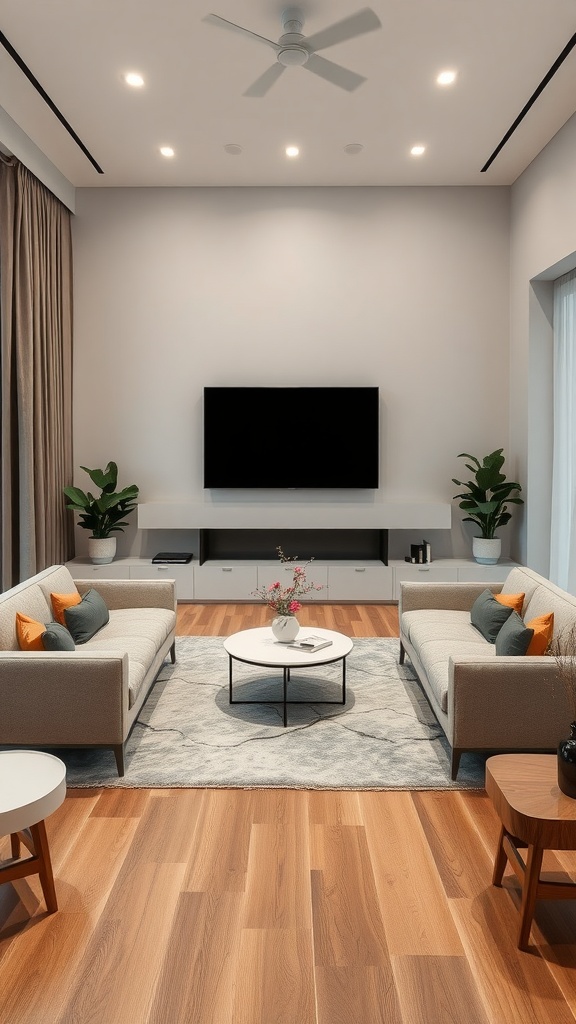 Natural elements play a role too. The potted plants bring life into the space, offering a refreshing contrast to the sleek furniture. Large windows allow for plenty of natural light, making the room feel even more spacious. This setup encourages a serene atmosphere, ideal for unwinding after a long day.