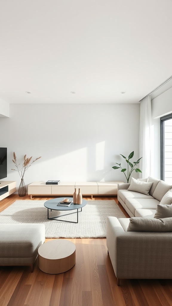 Creating a minimalist living room can be both relaxing and visually appealing. The image showcases a bright and airy space characterized by its clean lines and simple design. The light color palette enhances the feeling of openness, making it a perfect spot for relaxation.