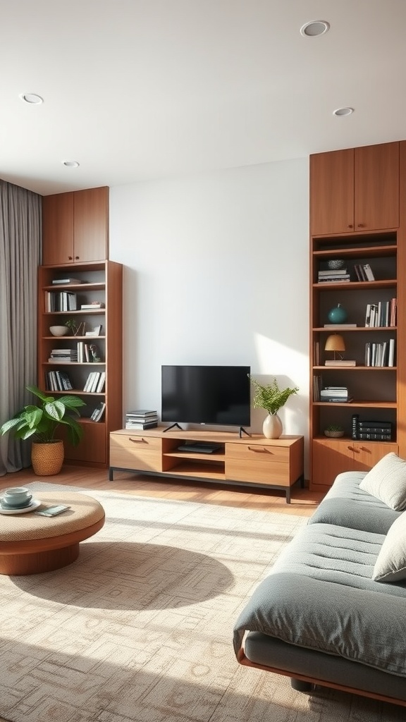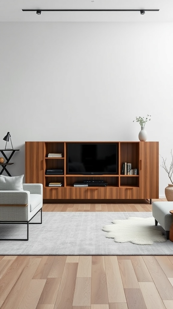 In a minimalist living room, hidden storage is key to maintaining a clean, uncluttered look. The image showcases a sleek wooden media unit that blends seamlessly with the room’s aesthetic. Its open shelves provide a perfect spot for books and other decorative items, while the closed sections keep essentials out of sight.