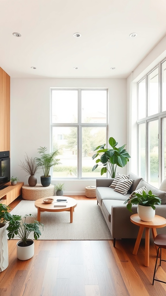 In a minimalist living room, natural elements play a key role in creating a warm and inviting space. The image shows a bright, airy room filled with plants that bring life and color to the environment. Large windows allow sunlight to flood in, enhancing the natural vibe.