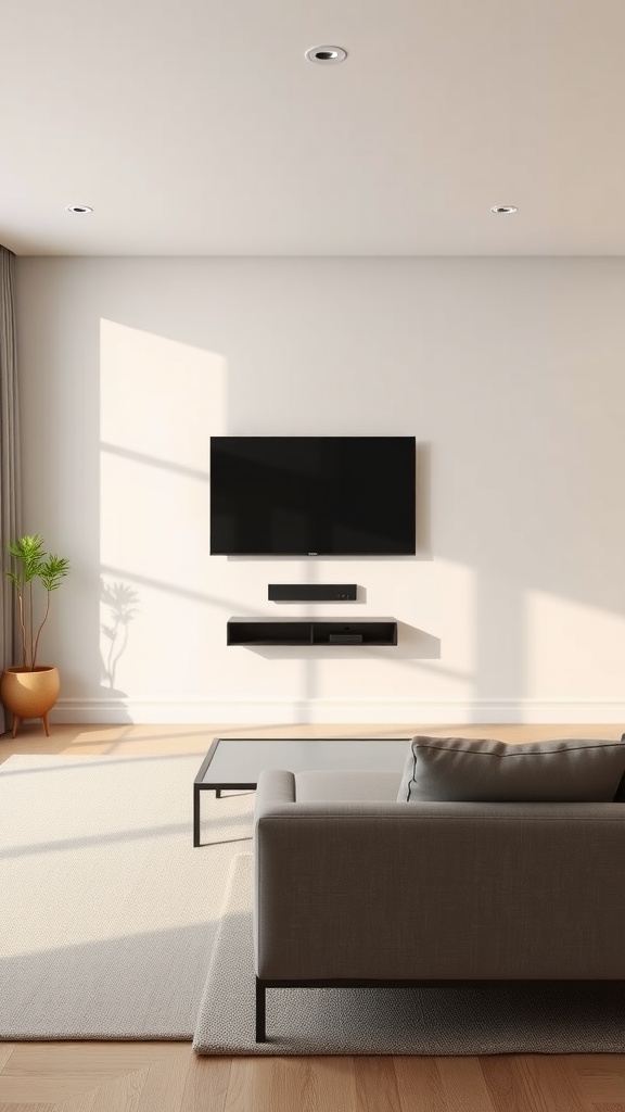 In a minimalist living room, technology often takes a back seat, blending seamlessly into the design. The image showcases a sleek TV mounted on the wall, which keeps the space open and clutter-free. This setup not only maximizes floor space but also keeps the focus on the room’s clean lines and simple aesthetic.
