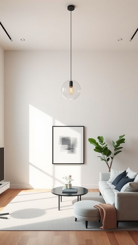 In a minimalist living room, lighting plays a key role in setting the mood. The image showcases a beautiful pendant light hanging gracefully from the ceiling. Its simple design complements the overall decor while offering a modern touch.