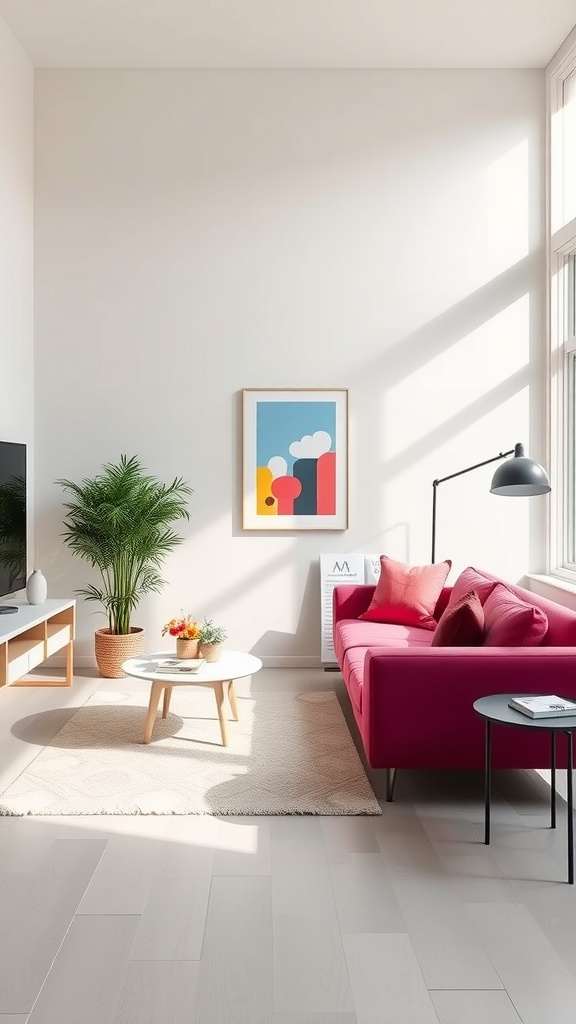 Minimalism doesn’t have to mean dull or lifeless. In this living room, a bright pink sofa brings a lively touch to the otherwise simple space. The bold color creates a striking contrast against the soft, neutral tones of the walls and flooring.