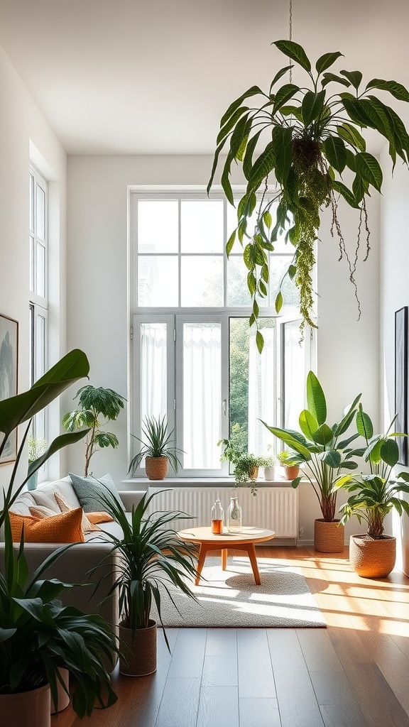 Notice how the light pours in, highlighting the unique shapes and textures of the plants. This natural light enhances the overall mood, making the room feel airy and open. The use of various plant sizes adds depth, drawing the eye across the room.