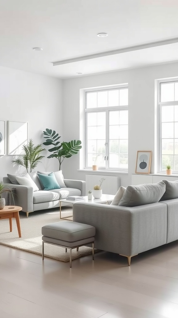 A neutral color palette creates a calm and inviting atmosphere in the living room. Soft grays and whites dominate the space, providing a clean backdrop that feels spacious and airy. This choice makes it easy to unwind after a long day.
