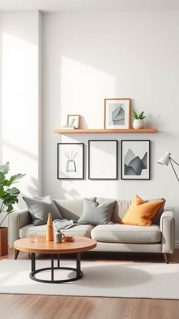 In a minimalist living room, personal touches really make a space come alive. The image showcases a clean and airy room with a soft color palette that creates a calm vibe. The light sofa and wooden furniture blend seamlessly together, providing comfort while keeping things simple.