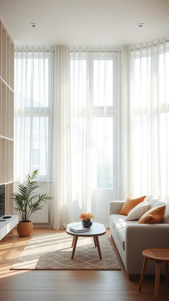 In a minimalist living room, the choice of window treatments plays a crucial role. The sheer, flowing curtains seen in this image allow natural light to flood the space. They create a soft, inviting atmosphere while maintaining privacy.