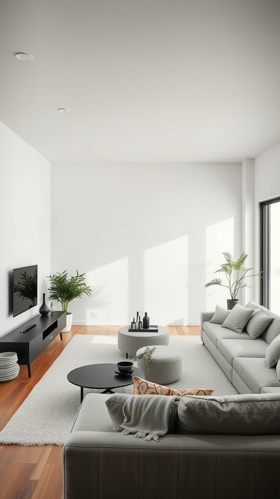 In a minimalist living room, color plays a key role in creating a calm and inviting space. The image showcases a serene setup where soft grays and light hues dominate. This gentle palette promotes relaxation and enhances the feeling of openness.