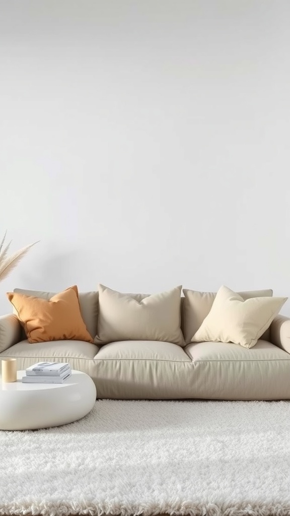 A minimalist living room creates a peaceful vibe with its soft textures and fabrics. The creamy sofa stands out with its plump cushions, inviting you to relax. Each throw pillow adds a gentle pop of color, balancing comfort with simplicity.