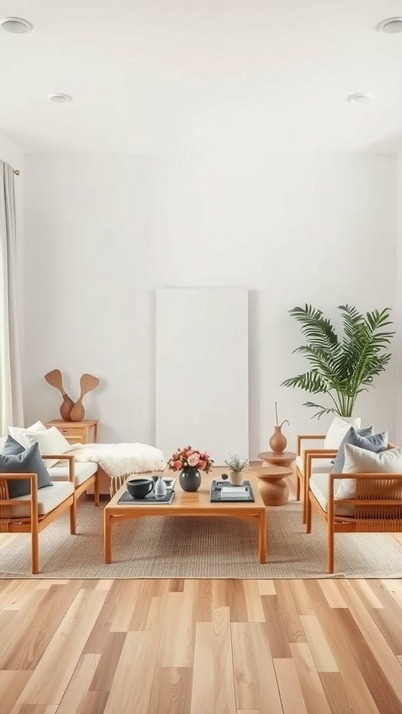 In a minimalist living room, layering is key to creating depth and interest. This space showcases how simple elements can work together beautifully. The light-colored walls and wooden flooring provide a warm foundation.