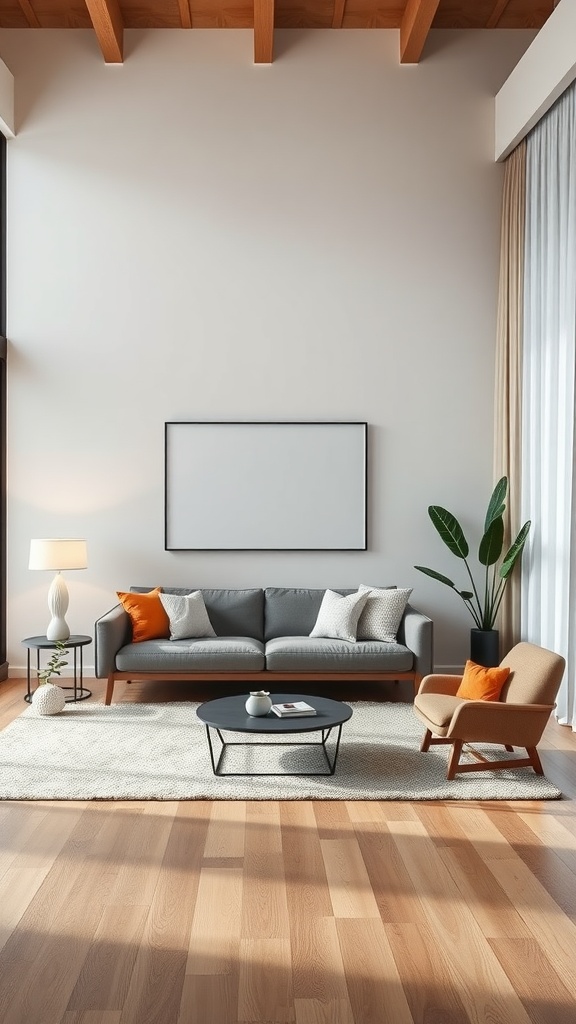 The soft colors and clean lines allow the eye to rest. The gray sofa, accented with orange pillows, creates a focal point without overwhelming the space. The empty wall draws attention to the simplicity of the design.