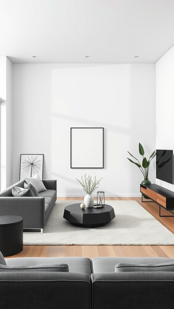 In a minimalist living room, geometric shapes play a significant role in creating a balanced and inviting space. The clean lines and simple forms contribute to an uncluttered environment. You can see how the round coffee table contrasts nicely with the angular sofa, making the room feel dynamic yet harmonious.