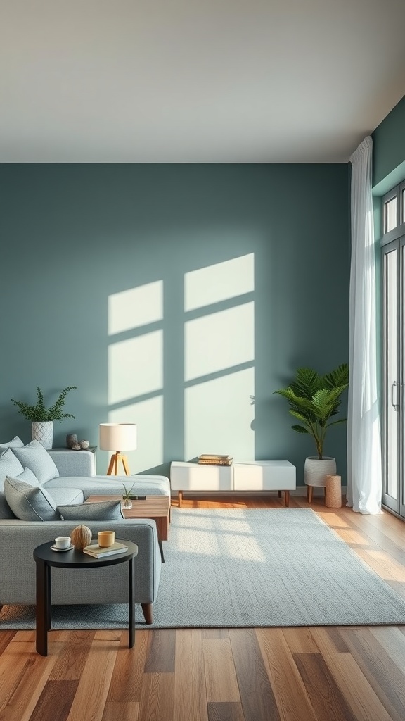 The wooden accents in the coffee table and flooring add warmth and balance to the cool tones. These natural elements introduce a touch of nature, promoting a sense of grounding. Green plants in the corner further enhance this effect, symbolizing growth and renewal.