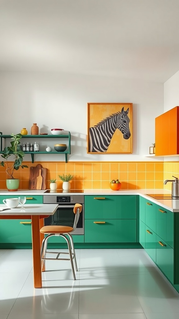 The orange backsplash introduces a warm contrast to the cool tones of the cabinets. It’s not just about aesthetics; these colors can influence mood and energy levels, making cooking and gathering a more enjoyable experience. Incorporating artwork, like the zebra print here, adds a playful touch that complements the kitchen’s overall theme.