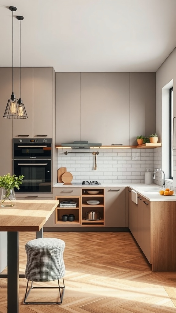 The cabinetry is sleek and minimal, providing plenty of storage without overwhelming the room. Notice how the open shelves display some kitchen essentials and add a warm touch with potted plants. This not only keeps things organized but also brings a bit of nature indoors.