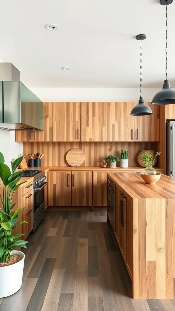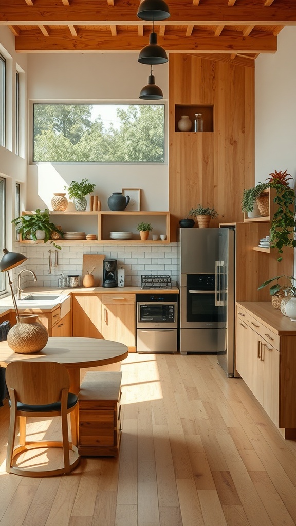 Additionally, the kitchen features plants that add a touch of greenery and improve air quality. Incorporating live plants into your kitchen design not only enhances aesthetics but also contributes to a more eco-friendly environment. The combination of natural wood and plants truly showcases how you can create a space that’s both functional and environmentally conscious.