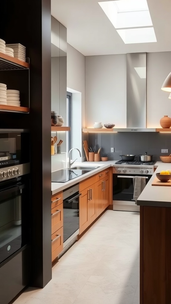 The sleek lines of the cabinetry and the smart use of open shelving allow for both style and functionality. With a well-thought-out layout, every corner serves a purpose, while the mix of colors keeps it visually interesting. This design encourages you to express yourself through your kitchen, making it a true reflection of your personality.
