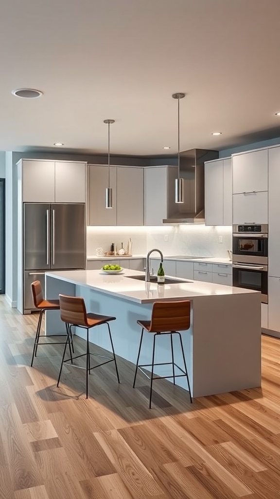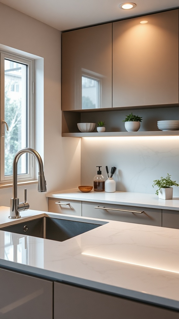 The clean lines and reflective surfaces not only look stylish but also make the space feel more open. Notice the smart lighting under the cabinets? It creates a warm ambiance while providing practical illumination for meal prep.