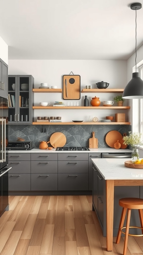 Colors play a vital role here. The subtle gray tones on the cabinets create a calming backdrop, while the pops of orange from the dishes and decor inject energy into the room. This balance of colors is key in modern kitchen design.