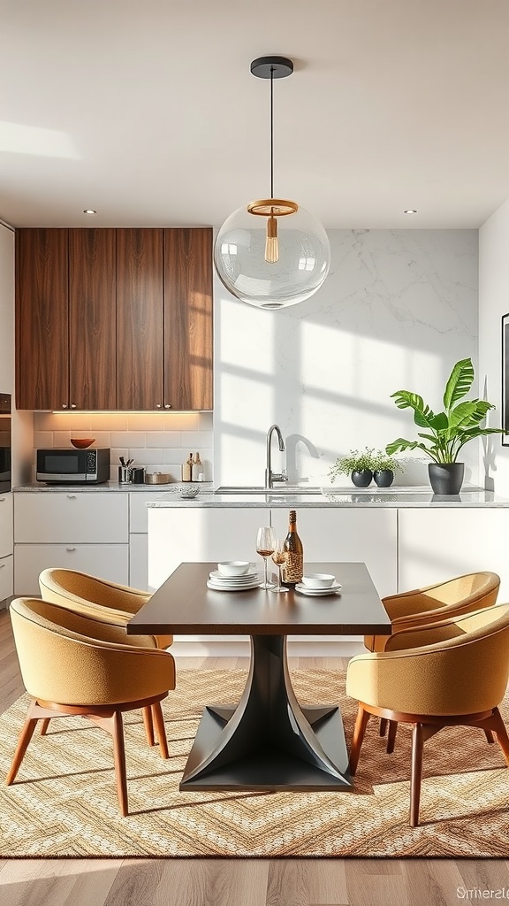 A pendant light adds a touch of elegance while providing ample lighting for meals. The addition of greenery on the countertop brings a refreshing vibe, making the space feel lively.