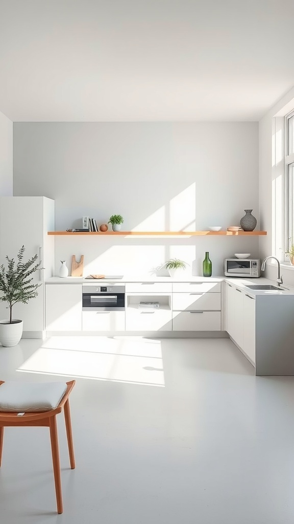 The use of white cabinetry and a light floor enhances the sense of brightness. Natural light floods in through large windows, highlighting the kitchen’s thoughtful design. A few well-placed decorative items, like plants and vases, add a touch of personality without overwhelming the space.